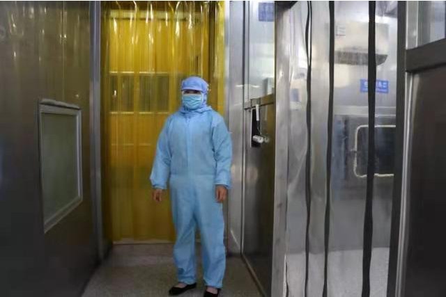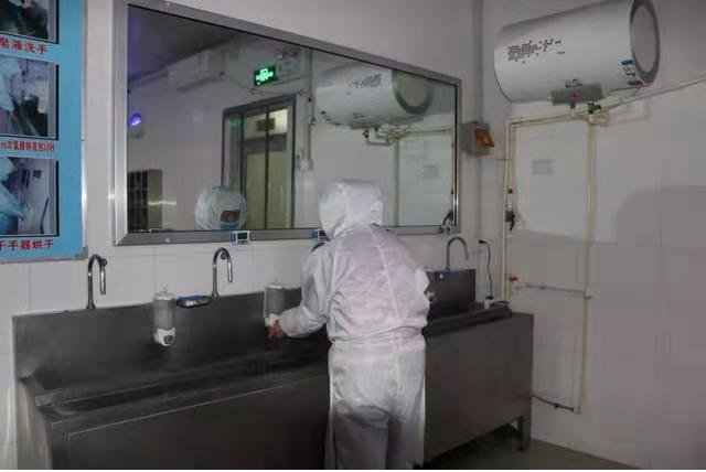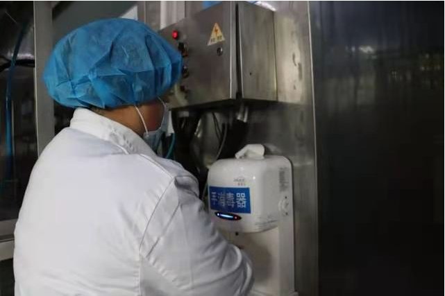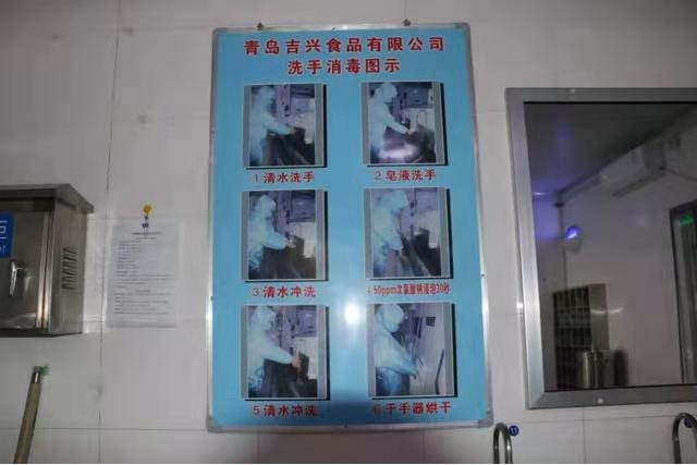 進入車間,檢查程序更為嚴格,我們被要求穿上了專門的消毒殺菌工作服,穿戴好了防護帽跟腳套,“這是我們公司專門的洗手消毒臺,我們還配有專門的洗手消毒提示,手消毒器、專門毛粘,多方面防護,確保員工不能帶菌、粘有毛發進入加工車間,員工防護服我們每天都消毒,咱們做食品加工的,一定得提升衛生標準跟要求,讓消費者吃的放心、安心。此外,我們員工也采取分批就餐,從11:20左右開始分餐,避免人員聚集。”質檢部主管李松萍說道。