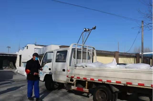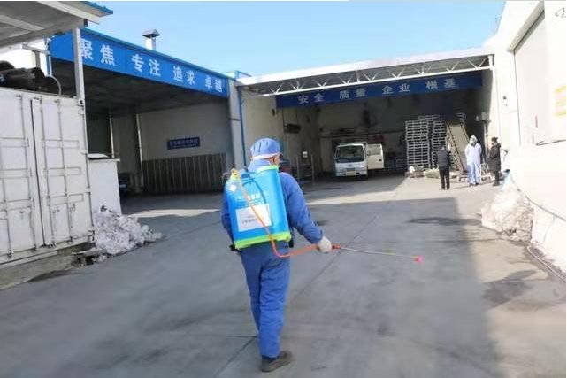 在門口經歷了車輛消毒、人員登記、體溫測量一系列檢查工作,我們被允許進入廠區,只見,廠區內工人不間斷的拿著消毒器噴灑消毒液,確保廠區消毒全覆蓋,無死角。“我們每天從七點就開始消毒了,每天上午下午各一次。”負責廠區消毒的何師傅說道。