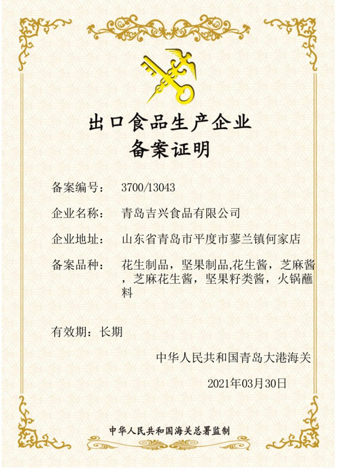 公司先后通過了HACCP、“全球BRCGS認證”等認證,公司擁有玻璃瓶花生醬清洗罐裝一體化自動生產線、10-30萬級空氣凈化灌裝車間,全自動化生產設備。配備美國黃曲霉素檢測儀、微生物/AV/POV獨立檢測室。
